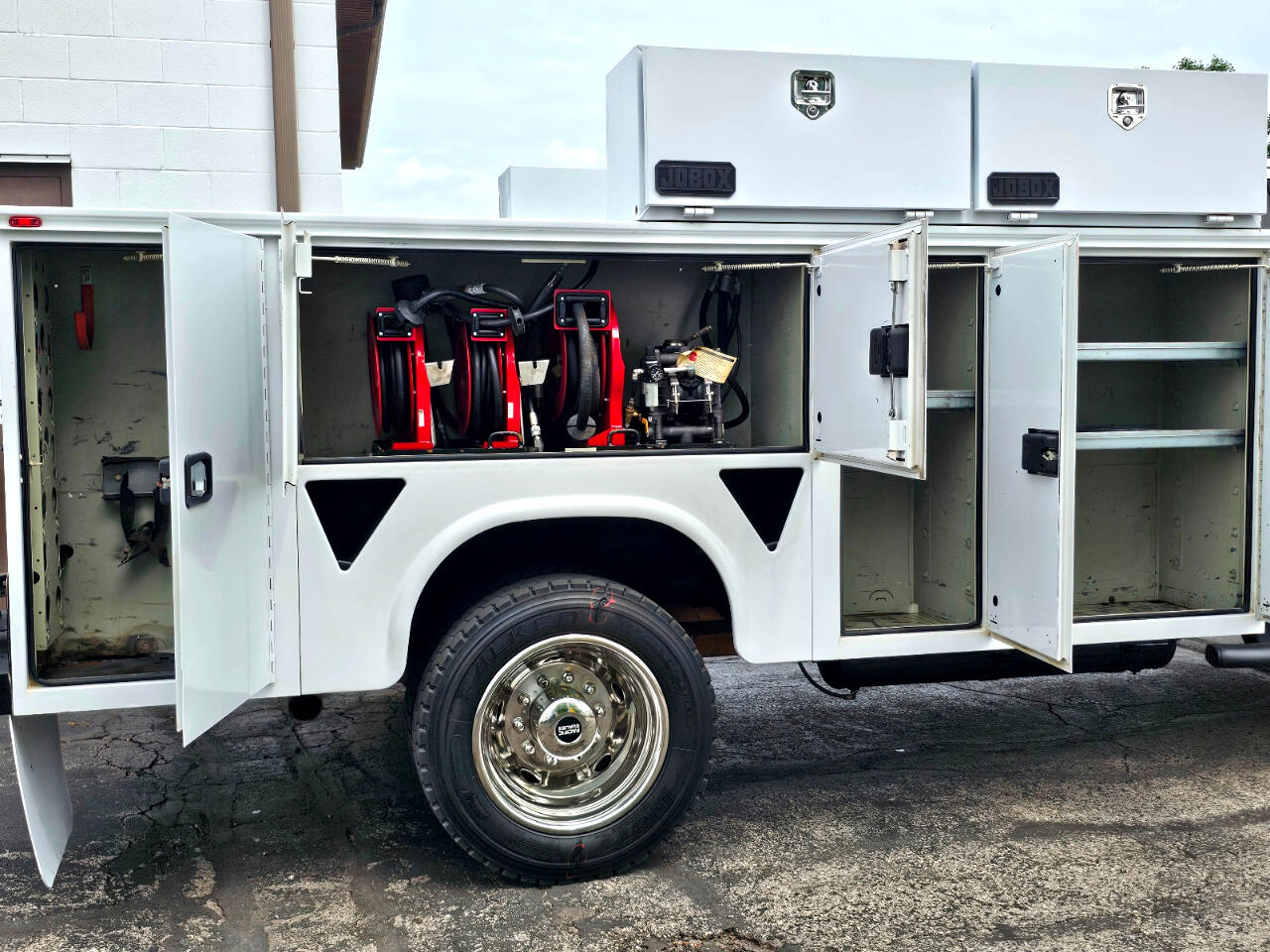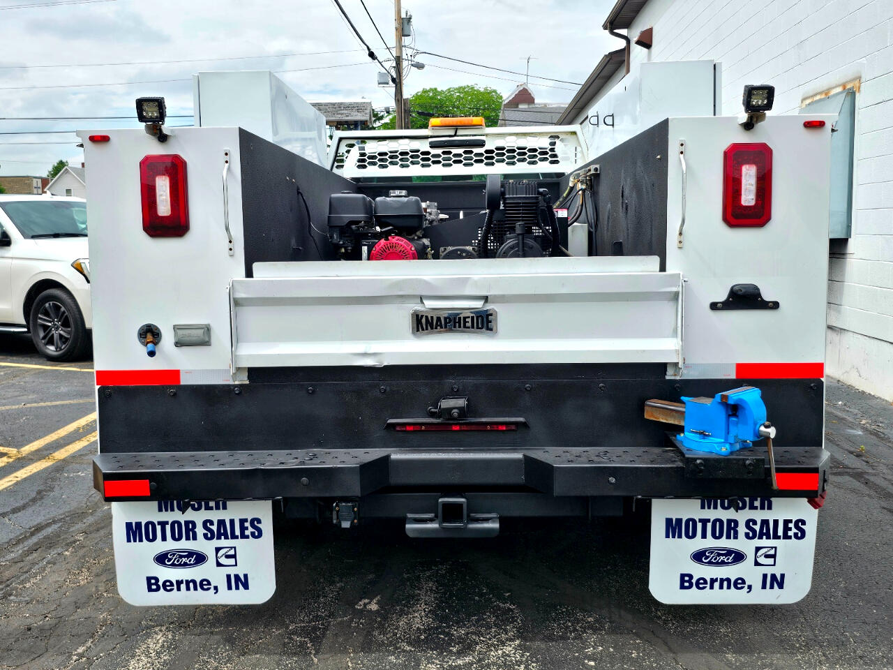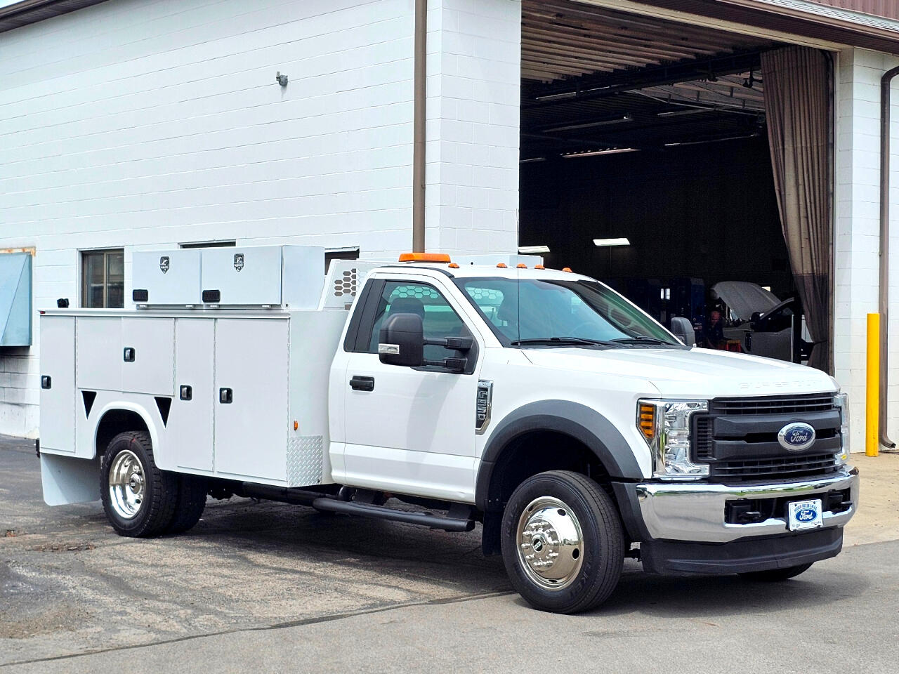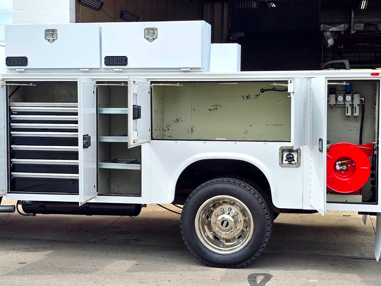 UH826. 2018 Ford F-550 4x4. Well equipped XL. 6.8 Triton V10 gas engine. 196.591 miles. 84" CA on 169" wheelbase. 11' Knapheide service body. 3 tank lube system, Mi-T-M comp/generator, 4 LH comp., 3 LH top boxes, 7 drawer Ctech in front left, 4 RH comp., 2 RH top boxes, tank comp in rear right, treadplate steel floor, receiver tube, RV spade. Price includes DOT inspection and 45 day temp plates.