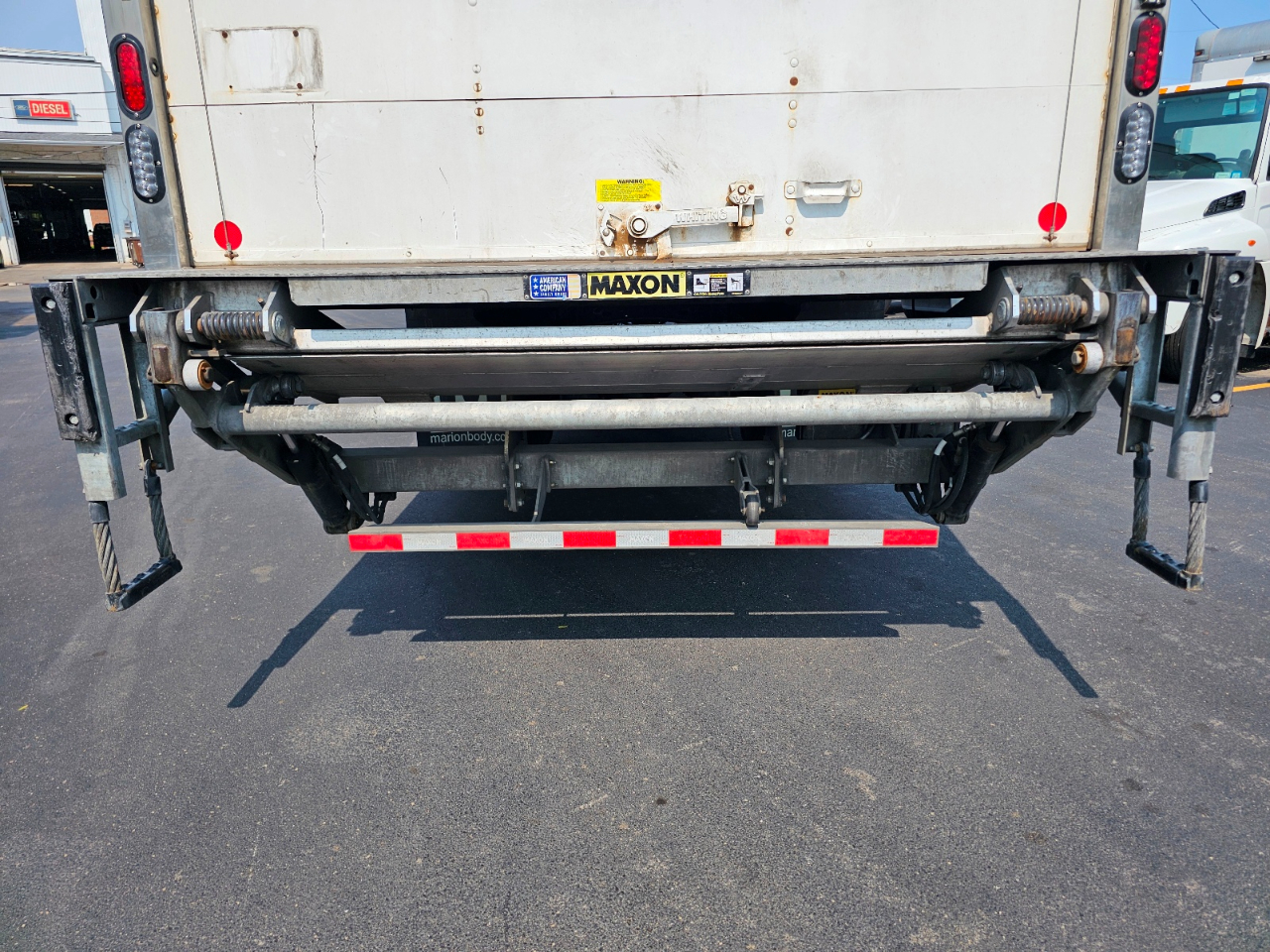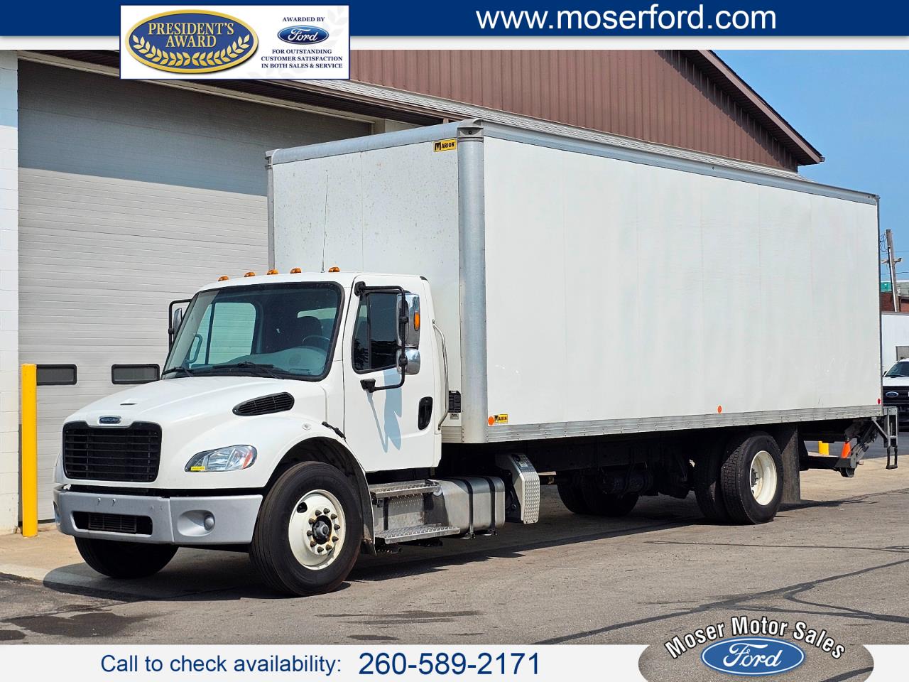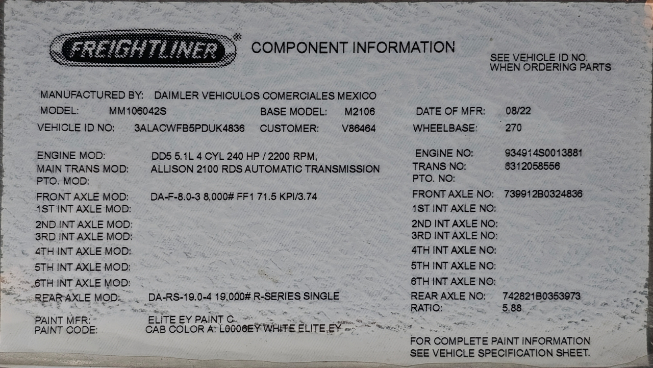 UH935. 2023 Freightliner M2 106. 197K miles. 26000 GVWR, under CDL. 204" CA on 270" wheelbase. Air brakes w/ ABS, air ride cab, driver seat, cruise, air dump valve, pwr mirrors, chrome mirrors. Detroit DD5 4cyl diesel; 240hp. Allison RDS2100 automatic transmission. 100g fuel tank. 26' Marion van body. 103"h x 102"w, rollup rear door, translucent roof, 3 rows Etrack, wooden scuff liner, treadplate steel threshold, SS rear door frame, forklift pkg, 3,000 lb Maxon GPT aluminum liftgate. Price includes DOT inspection and 45 day plates. Commercial financing for qualified customers and lower 48 state delivery available.