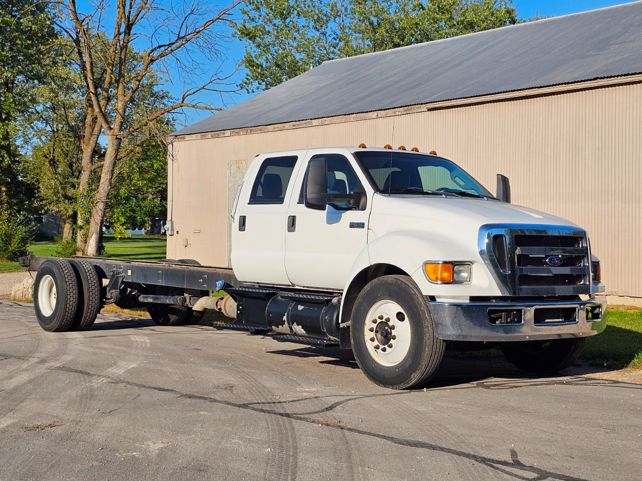 UH842. 2015 Ford F-650. 130,463 miles. 6.7 Cummins ISB diesel; 200hp. Auto transmission. 168" CA on 278" wheelbase. 22' of frame behind cab. Under CDL, 26000 GVWR. Air brakes w/ rear air ride. Price includes DOT inspection and 45 day plates. Photos taken prior to reconditioning.