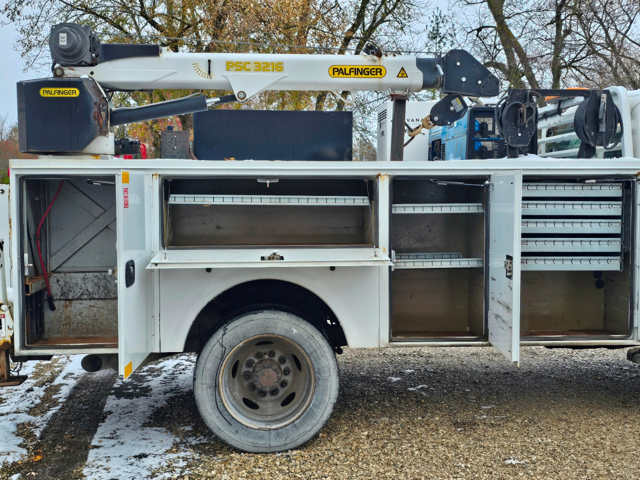 UH914. 2015 Ford F-550. 4x4. 166K miles. Well equipped XL. Supercab. 6.7 Powerstroke diesel. Auto trans. 4,000 lb Palfinger PSC3216, wireless remote, manual rear outriggers, RS Vanair Viper compressor, 85 CFM @ 100 PSI. 11' Palfinger service body. Miller Bobcat 250, 4 comp per side, 3 drawer unit above left wheel, parts drawer in front RH, treadplate steel floor, 1,300 lb TommyGate liftgate, receiver tube, pintle/ball hitch, RV spade. Price includes DOT inspection and 45-day plates. $148 document fee, transportation and sales tax (if applicable) are additional. We accept cash up to $10,000 before being required to report via IRS Form 8300, certified or cashier’s checks which must be verified prior to completing purchase, credit card (3% fee) and financing to qualified buyers. Photos taken prior to reconditioning.