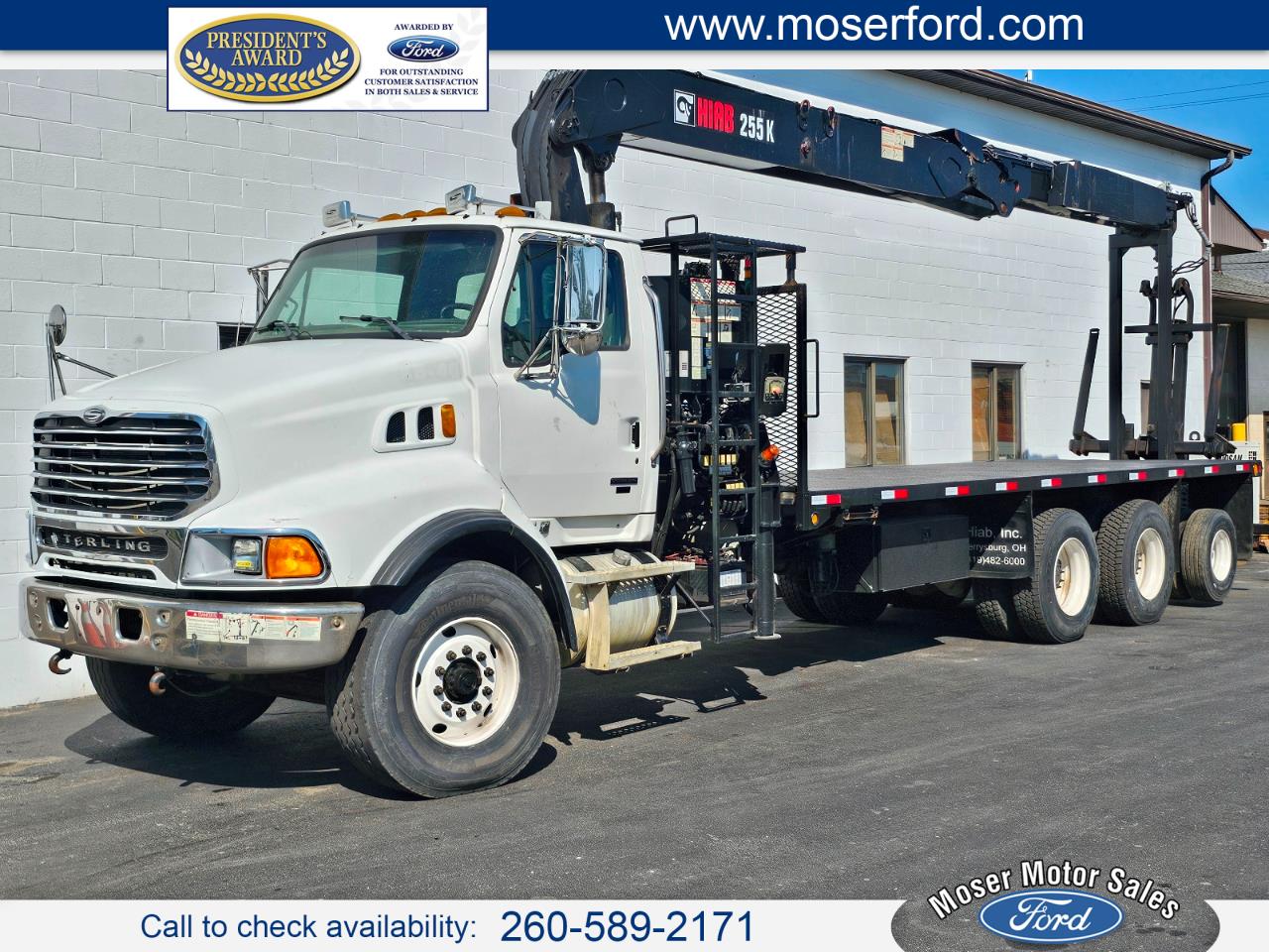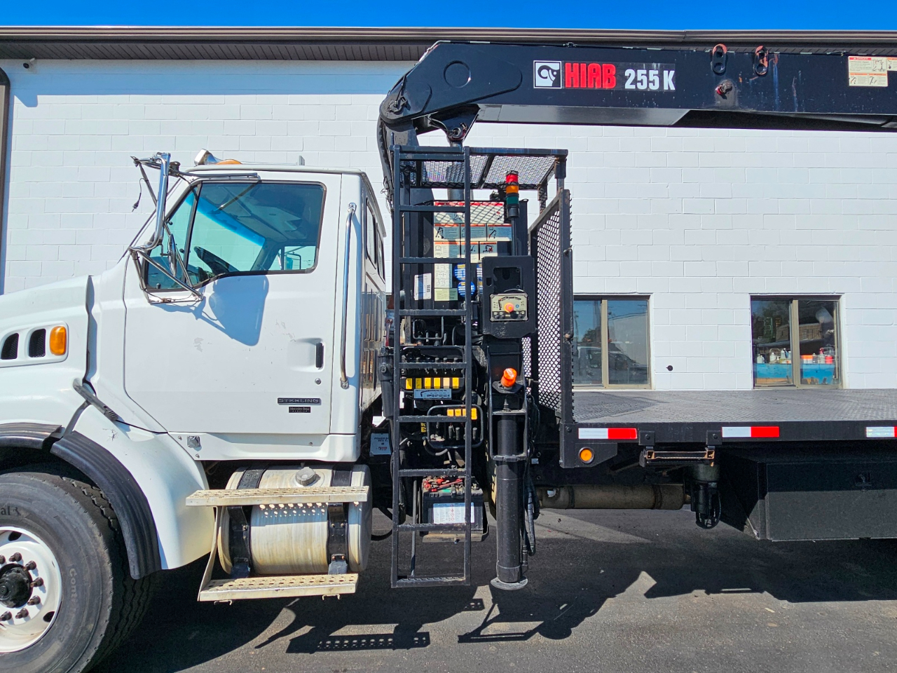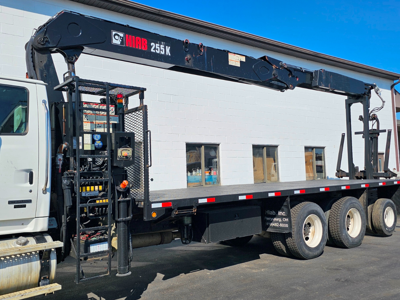 UH934. 2007 Sterling LT9500. 58K GVWR. 225K miles. 210" CA on 274" wheelbase. 12.8 liter Mercedes MBE460 diesel; 410hp. Allison RDS4000 automatic transmission. Air ride seat. Locking rear differential. 24.5' Fab flatbed. 96" wide, 49" bulkhead, treadplate steel floor, RH winch track, 6" long sills, 3" structural x-members on 12" centers, LH underbody box, Hendrickson tag axle No.R3T16D-S33GD. Hiab 255K-3 drywall crane. Price includes DOT inspection and 45 day temp plates. Commercial financing for qualified customers and 48 state delivery available. Photos taken prior to service and reconditioning.